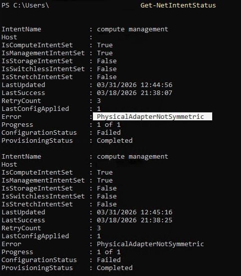 ConfigurationStatus should be "Success" ProvisioningStatus should be "Completed" Der entsprechend ausgeführte Befehl zeigte für alle Cluster Knoten eine fehlgeschlagene Konfiguration des Network ATC Netintents „compute_management“ und als Fehlerursache „PhysicalAdapterNotSymmetric“ an: