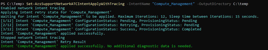 Hierzu verwendete ich den Set-AzsSupportNetworkATCIntentApplyWithTracing-Befehl um bei einem erneuten Fehler, die Ursache hierfür über die hier erzeugten Traces nachvollziehen zu können:
