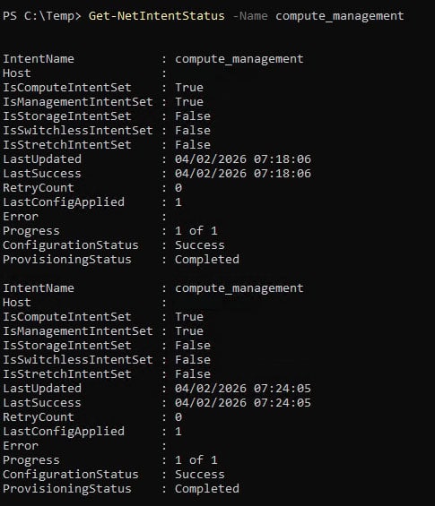 Da aber die NetItent-Anwendung jetzt auf beiden Cluster-Knoten erfolgreich abgeschlossen wurde, änderte sich tatsächlich auch der Get-NetIntentStatus wie erhofft auf „ConfigurationStatus: Success“:
